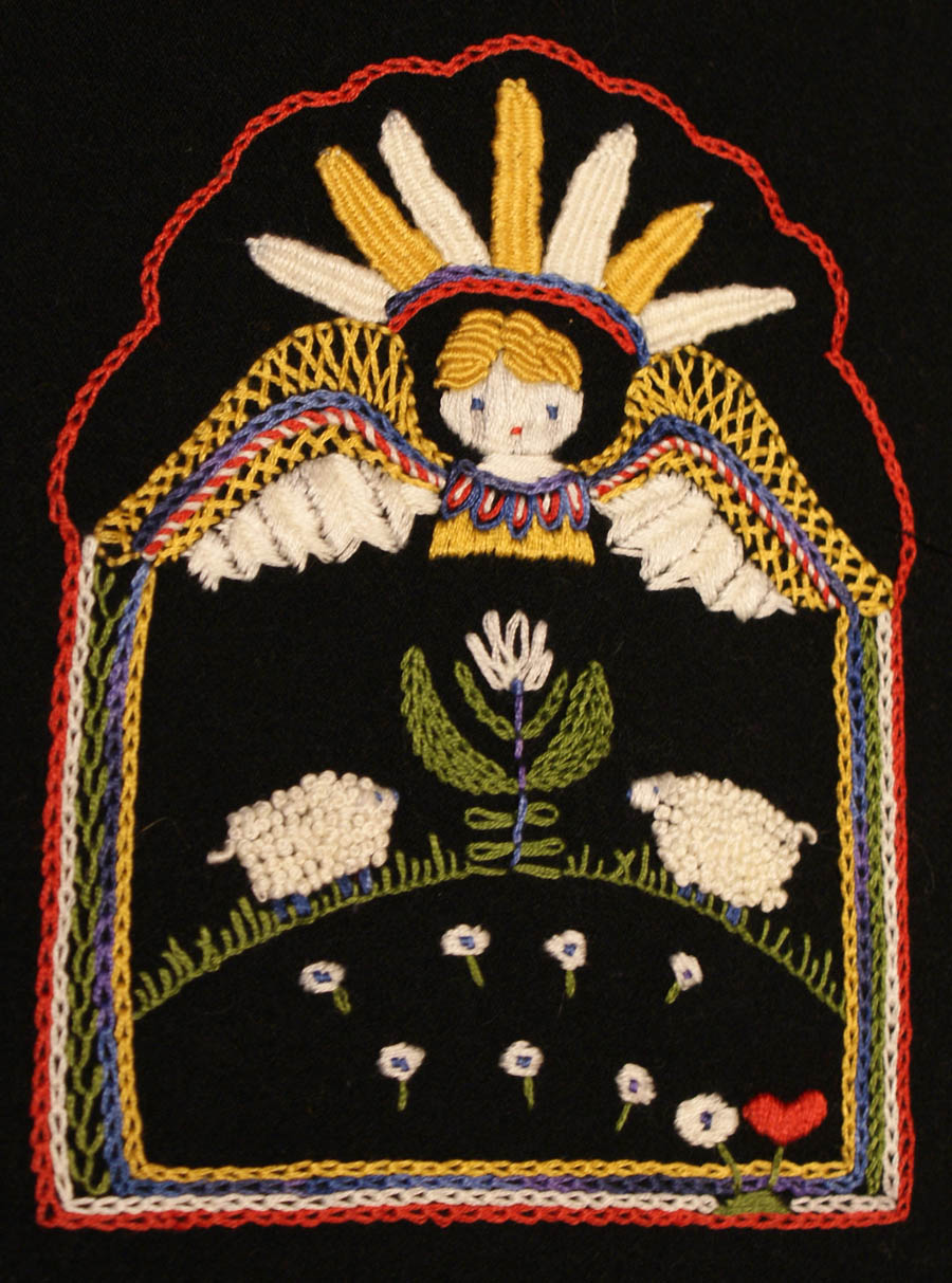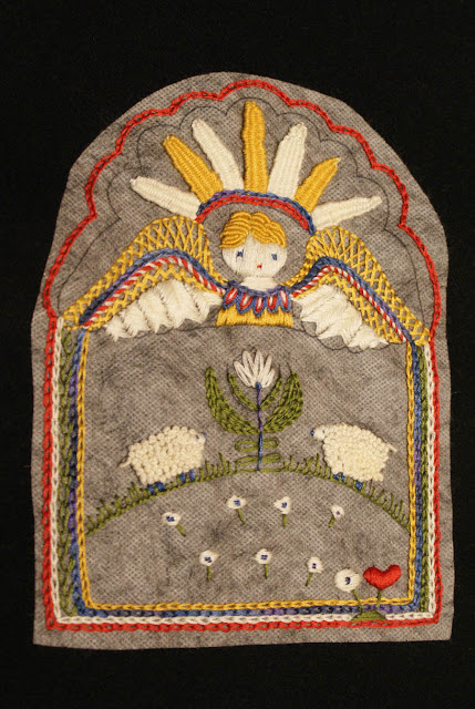 I just learned today that angels with multicolor wings are traditionally archangels. So this is an archangel watching his flock by night.