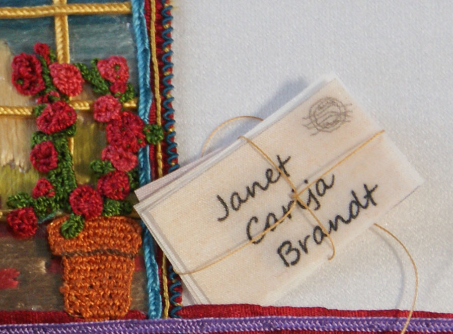 I created my ‘letters’ in Photoshop, printed them out on silk printer ready fabric, then coated them with a gloss varnish. I hope the varnish will keep the silk from fraying.
