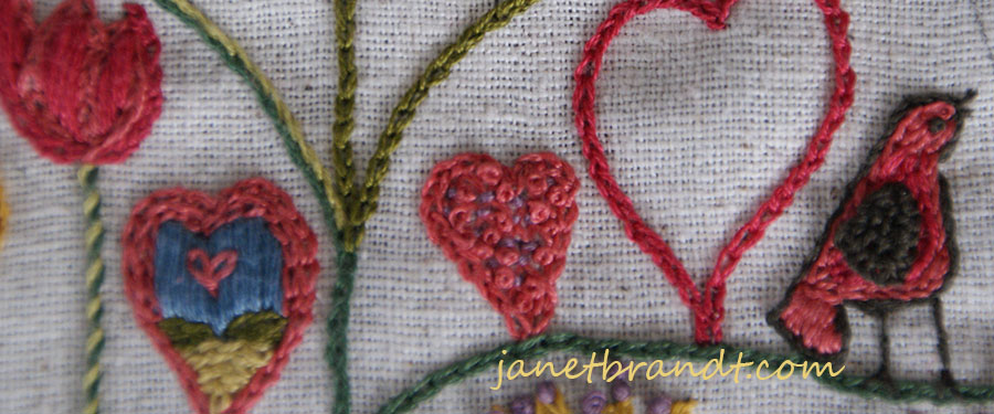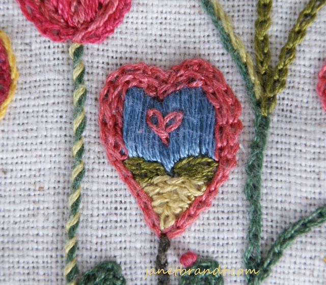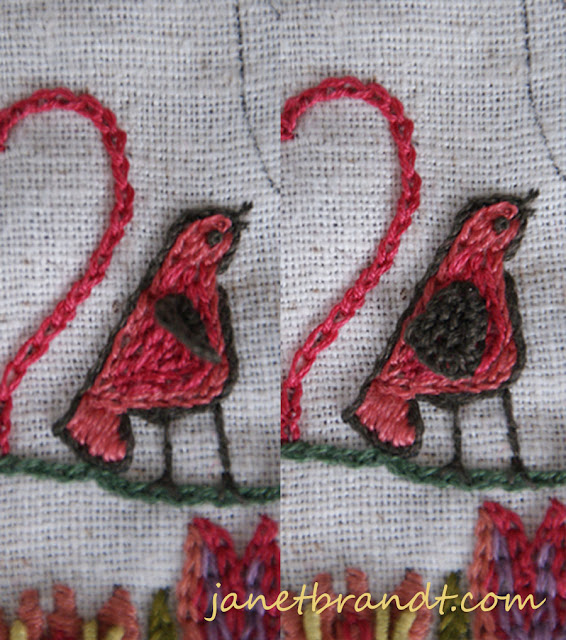 My goodness, you are a speedy stitcher!! this is coming along beautifully. It's wonderfully inspiring to see how you use all the many stitches and colors. I haven't stitched anything in a long time, and watching your SAL is giving me itchy fingers! 🙂