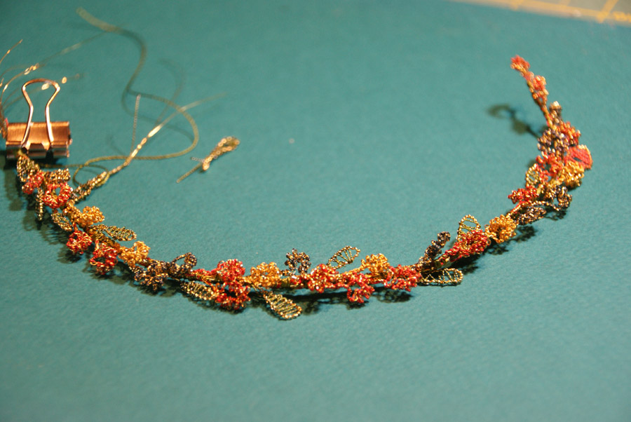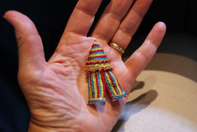 The photo above shows how each flower was made. A short length of metal purl was stretched out over a base wire. This was then wrapped with Gilt Silk Twist. Then that entire combination was wrapped around a large needle, slipped off the needle, looped in half with the ends twisted together.